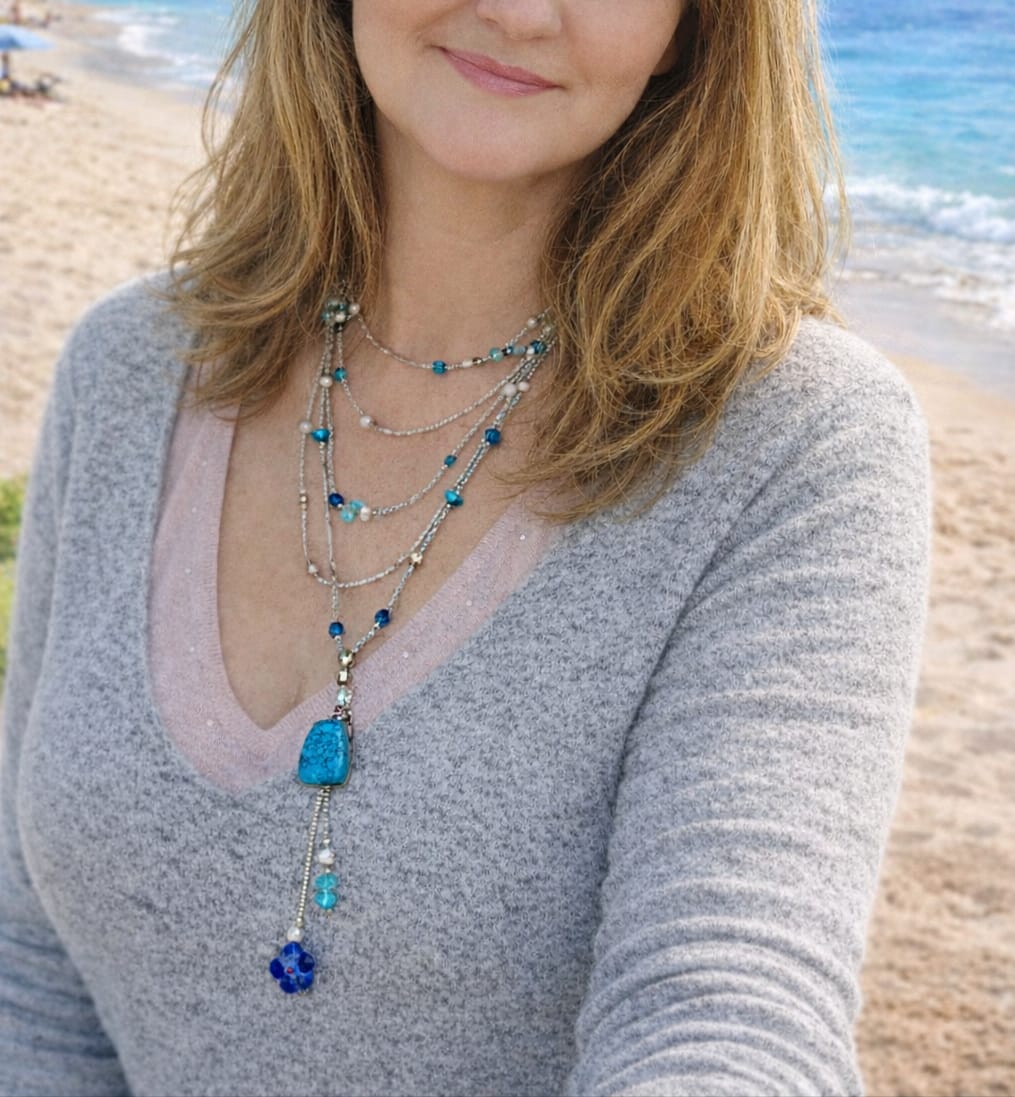 Descubre el Collar Modelo Bahía Turquesa, una pieza única que refleja la esencia del verano. Este collar está meticulosamente hecho a mano, utilizando hilo de plata y adornado con una hermosa turquesa de 2,5 cm. Cada cuenta se coloca con cuidado, asegurando que cada detalle cuente.