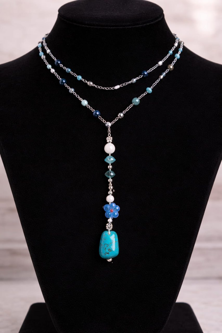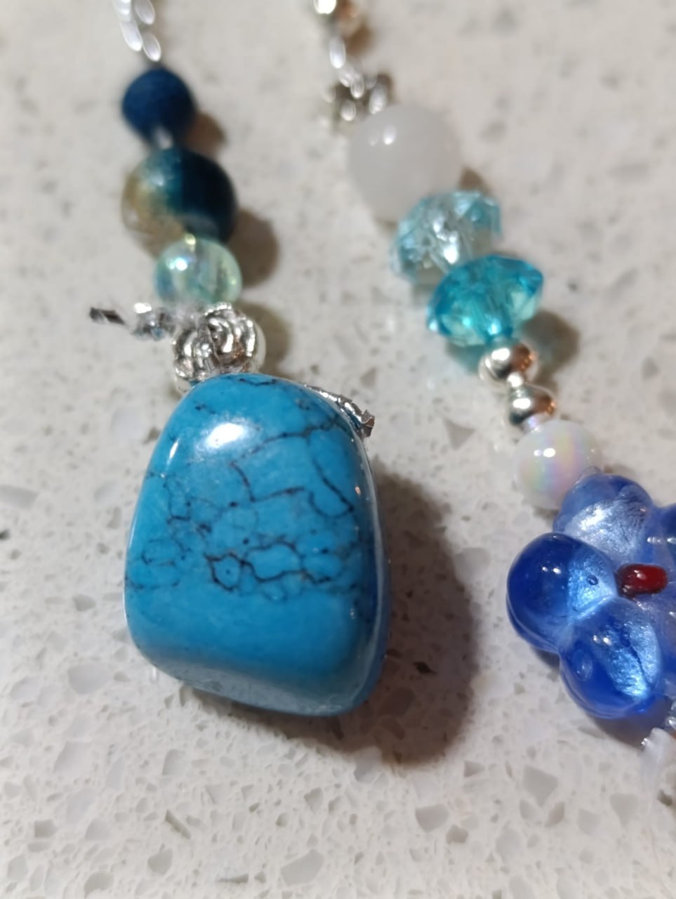 Este collar artesanal destaca por su delicadeza y luminosidad. Con una turquesa de 2,5 cm como protagonista, combina cristales azules y piedras blancas, creando un aire fresco y elegante. Perfecto para iluminar cualquier look veraniego.