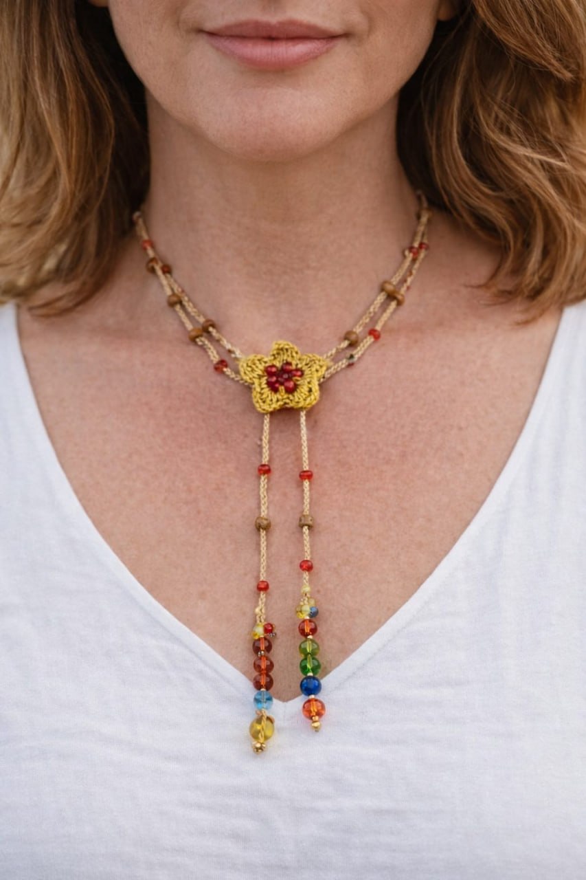 Descubre el Collar Modelo Damasco, una pieza que destaca por su diseño exótico y artesanal. Este collar se elabora con una flor tejida a crochet que adorna el centro del cuello, aportando un aire fresco y original a tu estilo.
