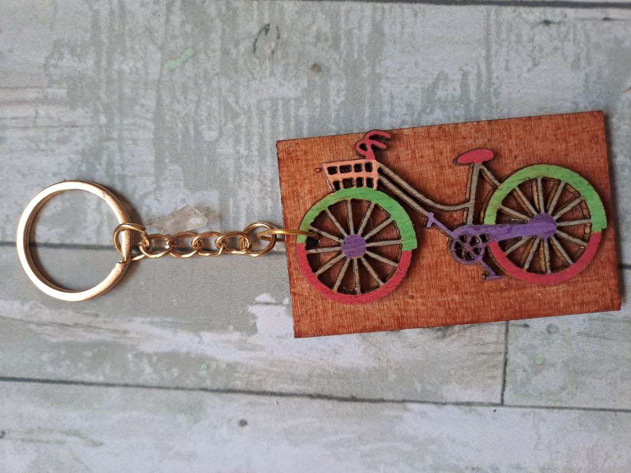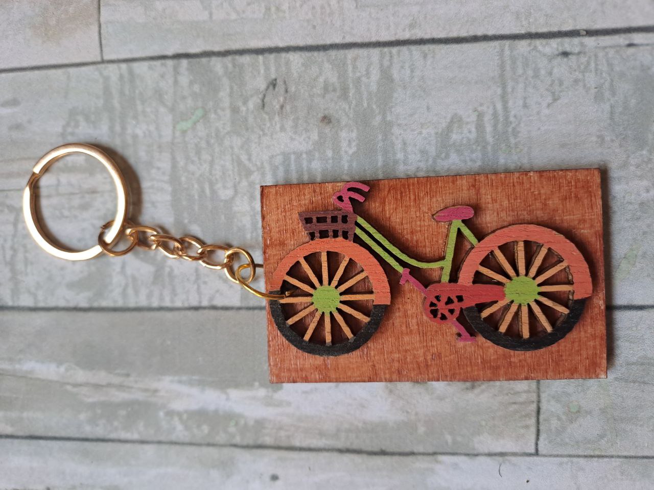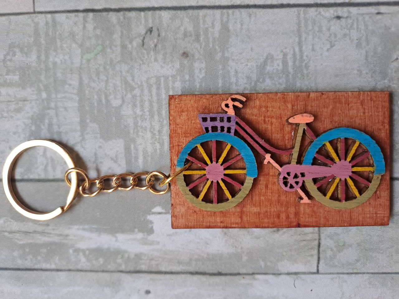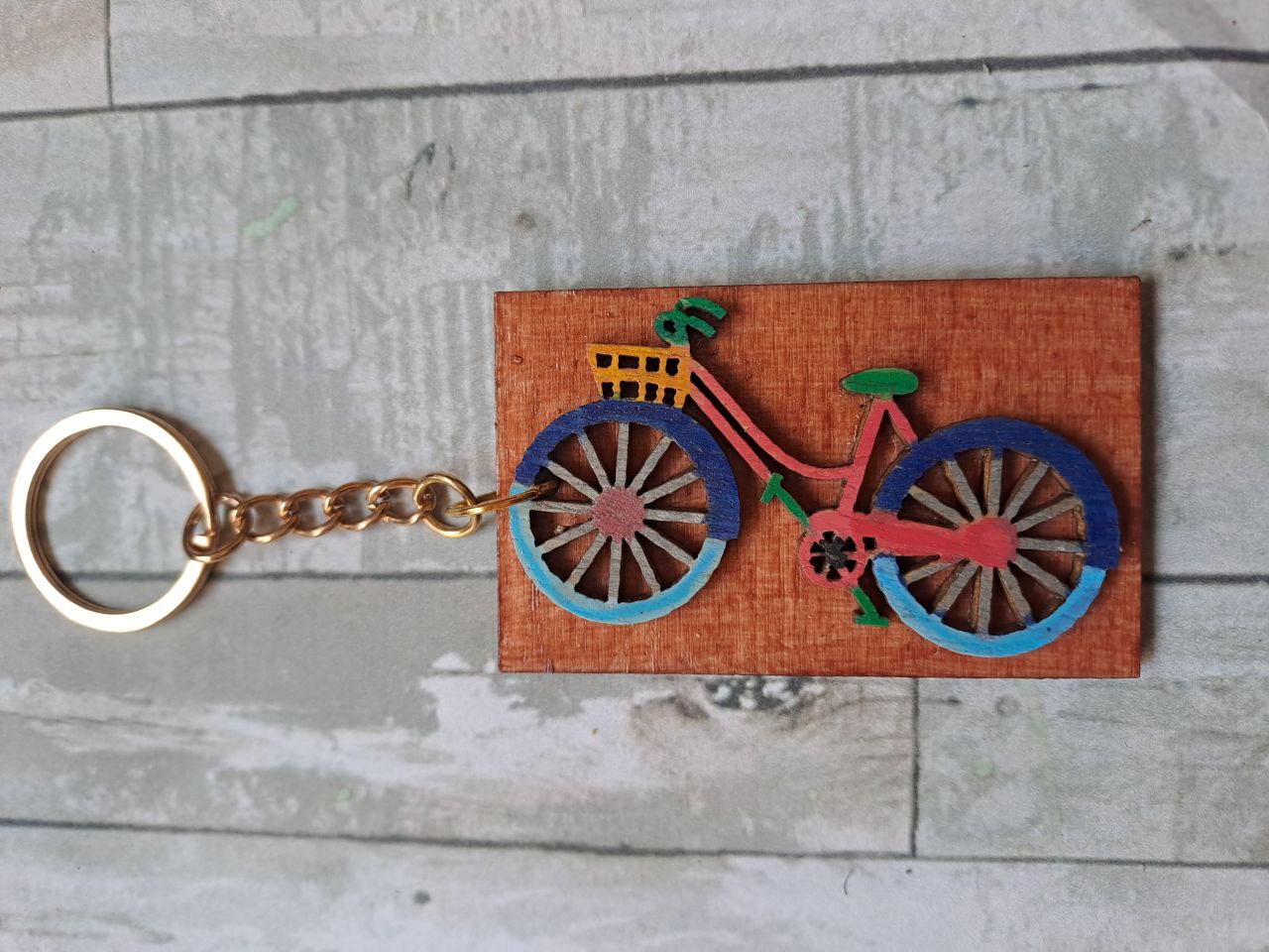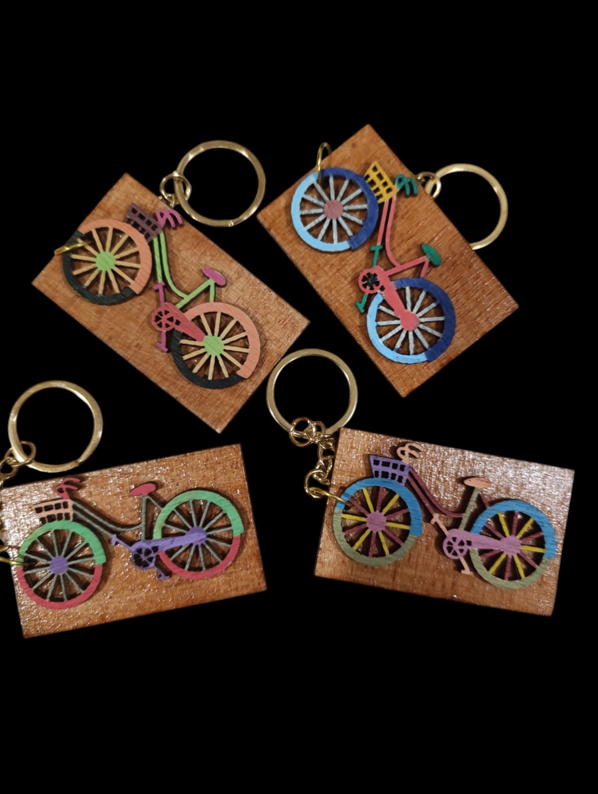 Llavero rectangular con bicicleta decorada a mano en diversos colores.