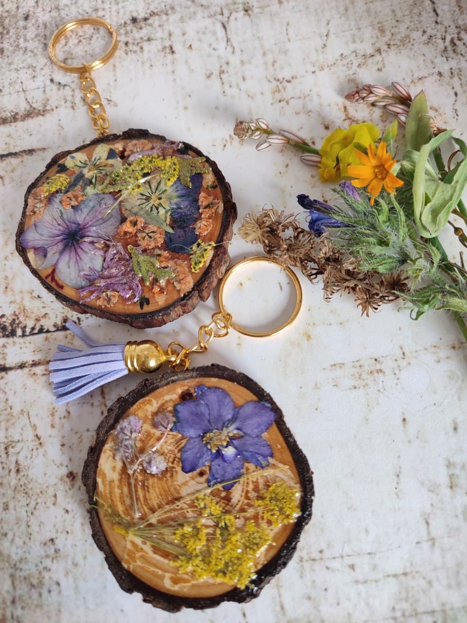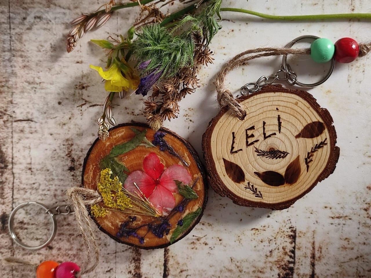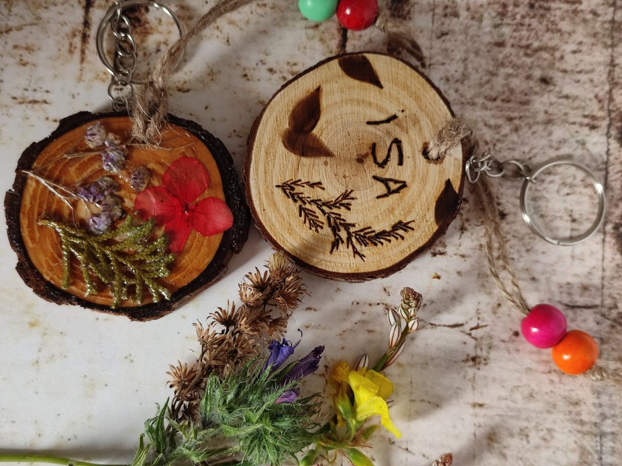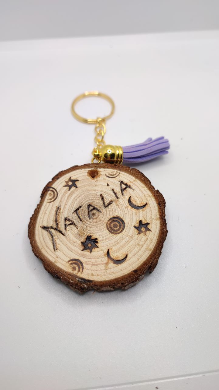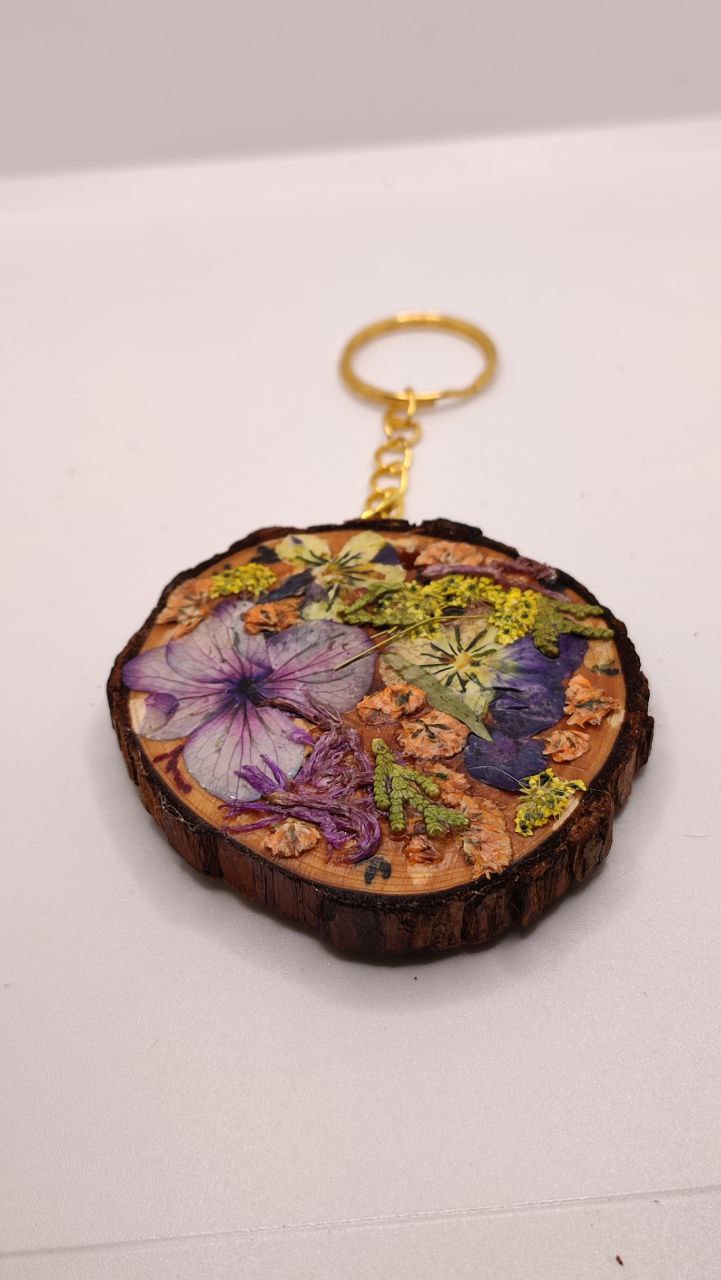 Si quieres regalar algo original mira este llavero de madera decorado a mano, realizado con una rodaja de rama natural, adornado por una de las caras con flores naturales, con capa de barniz en brillo para protección, y por la otra (opcional) pirograbado personalizable.