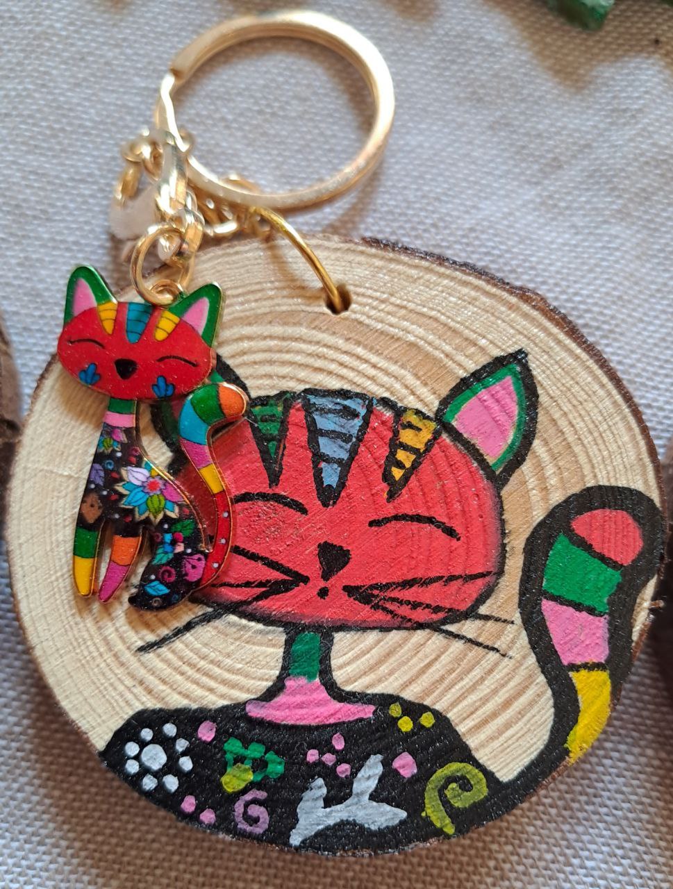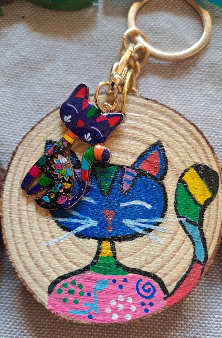 Llavero de rodaja de madera natural, pintado a mano con una cara de gato y charm y juego.