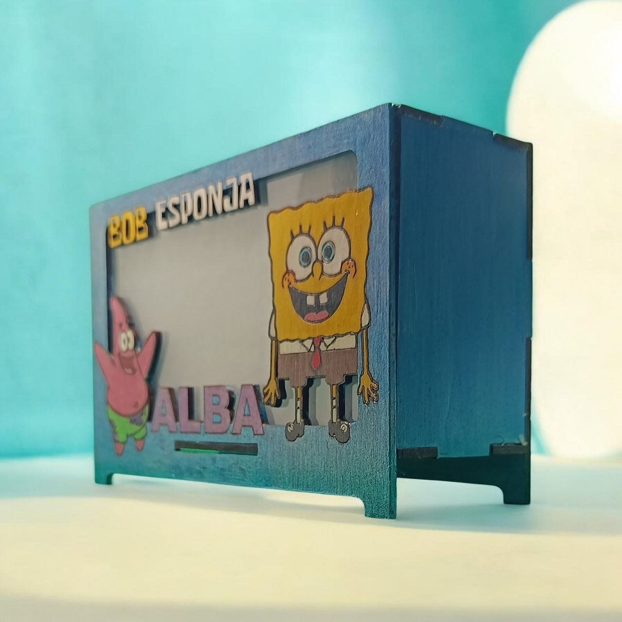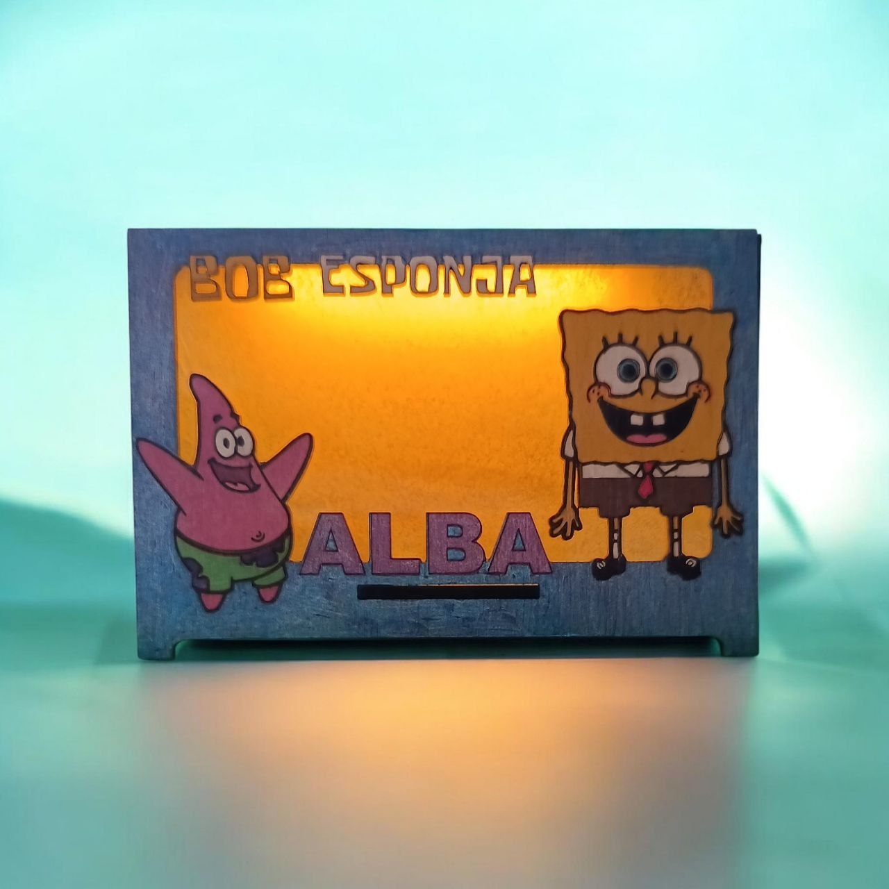 Su diseño incluye a los entrañables personajes de la serie de dibujos animados Bob Esponja, con el propio Bob Esponja y su amigo Patricio Estrella en un entorno que recrea su hogar en el fondo del mar. Es perfecta para iluminar habitaciones infantiles, creando un ambiente acogedor y divertido 🌊.