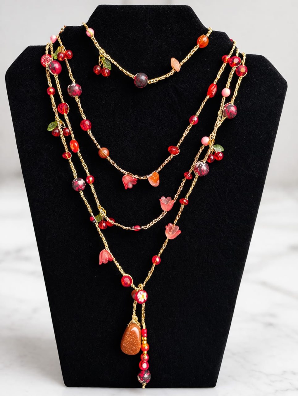 El collar está elaborado con auténtico jaspe rojo y cristales austriacos, además de pequeños elementos decorativos en forma de tulipas, flores y cerezas. Estas características le otorgan un aire romántico y delicado, ideal para cualquier ocasión. 🌷
