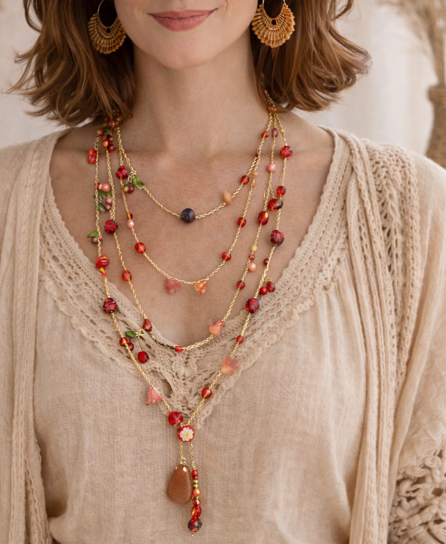 Descubre el Modelo Red Garden, un collar largo y artesanal que destaca por su tejido a mano en hilo dorado. Inspirado en la belleza de un jardín lleno de tonos rojos, este collar es perfecto para quienes buscan algo especial y diferente.