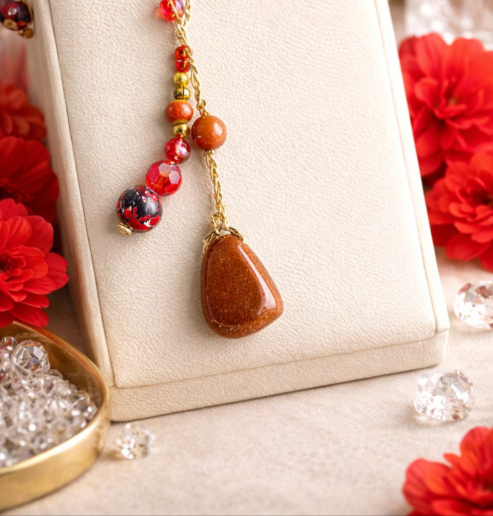 Como detalle final, cuenta con una hermosa pieza de piedra de sol en una de las terminaciones, que aporta un toque de luz y color. Este collar es la elección perfecta para dar un toque distintivo a tu look diario o para esos momentos especiales. ❤️