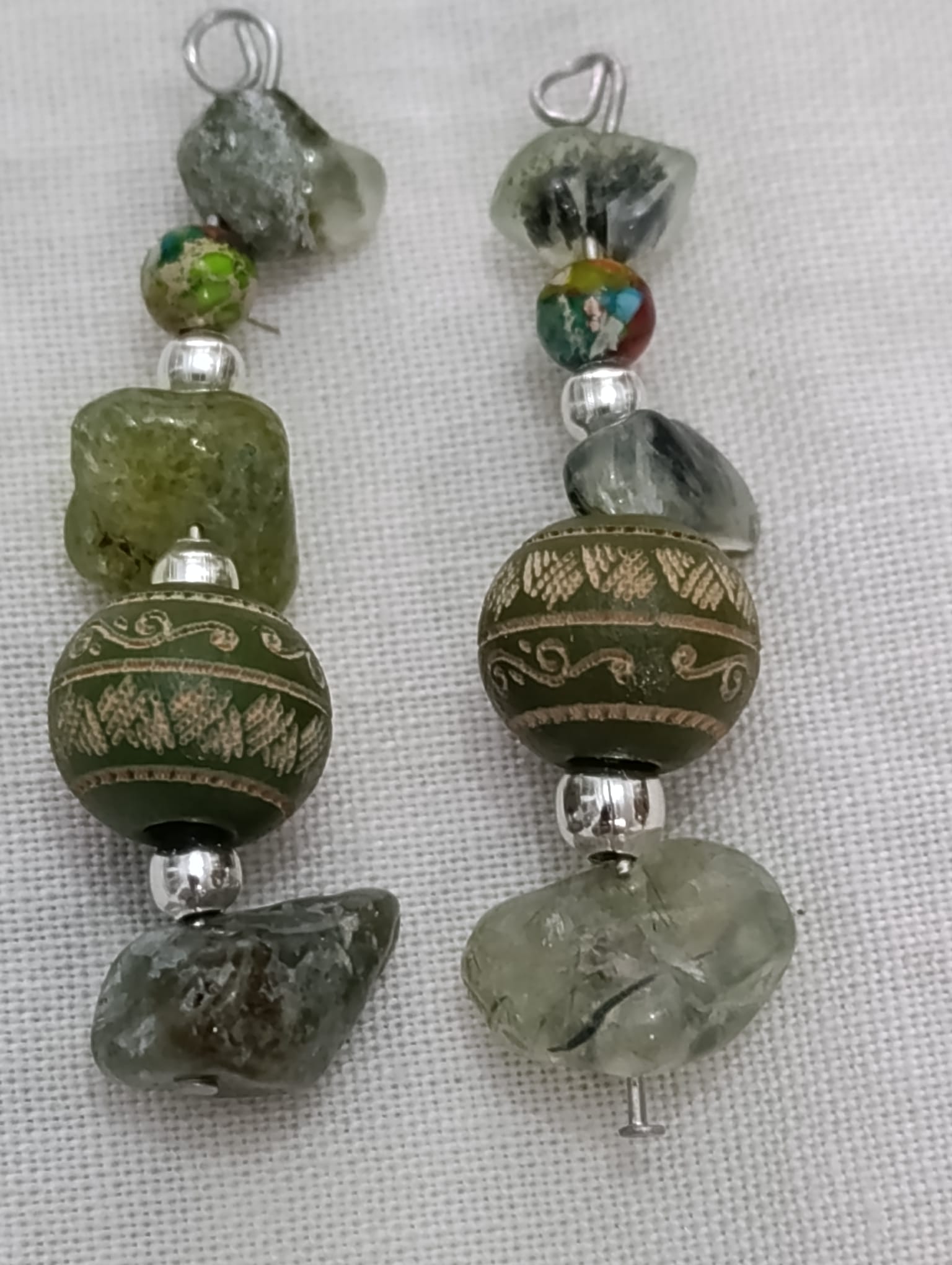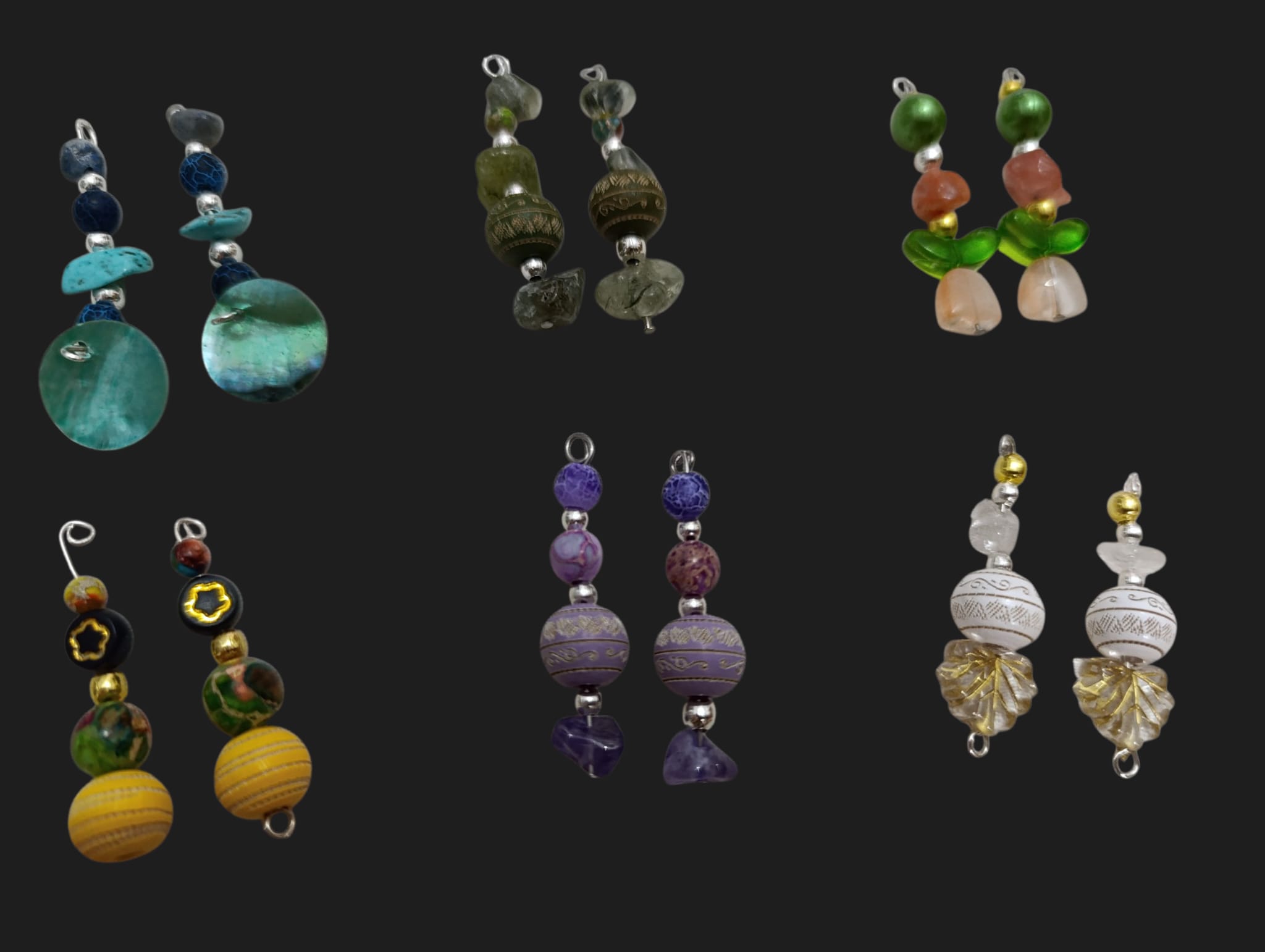 Piezas únicas inspiradas en Bisbee (Arizona), cuna de la cultura hippie. Cada par combina piedra natural, concha de mejillón, madera y cristal, creando composiciones irrepetibles de color y textura. Hechos a mano, ligeros y con mucho movimiento: el toque boho perfecto para elevar un look diario o dar personalidad a un outfit festivalero. No hay dos iguales.