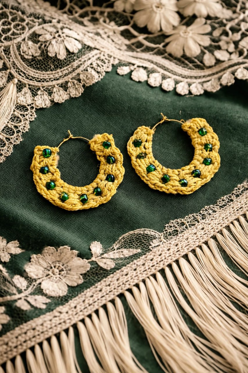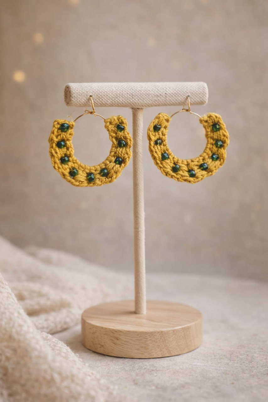 Descubre la elegancia y singularidad de los Pendientes Modelo Alhambra. Estos pendientes artesanales están elaborados a mano con una técnica de crochet que resalta su diseño bohemio y sofisticado. En un atractivo tono dorado mostaza, cada pieza está adornada con delicadas perlitas verde esmeralda que brillan con cada movimiento, aportando un toque de luz y frescura a tu look.