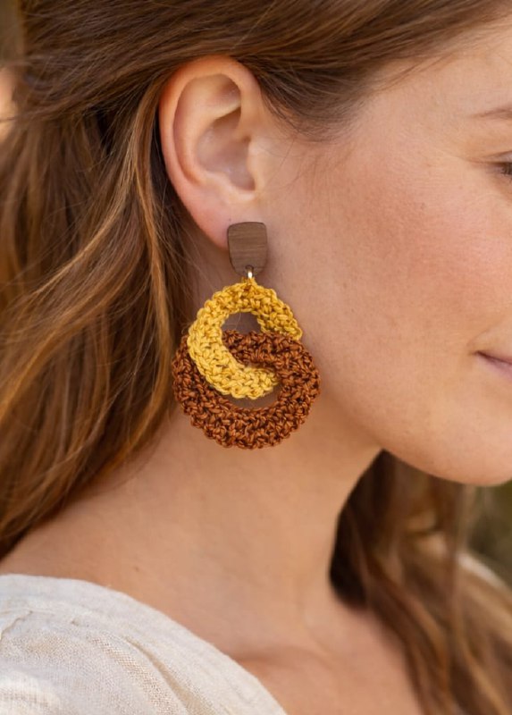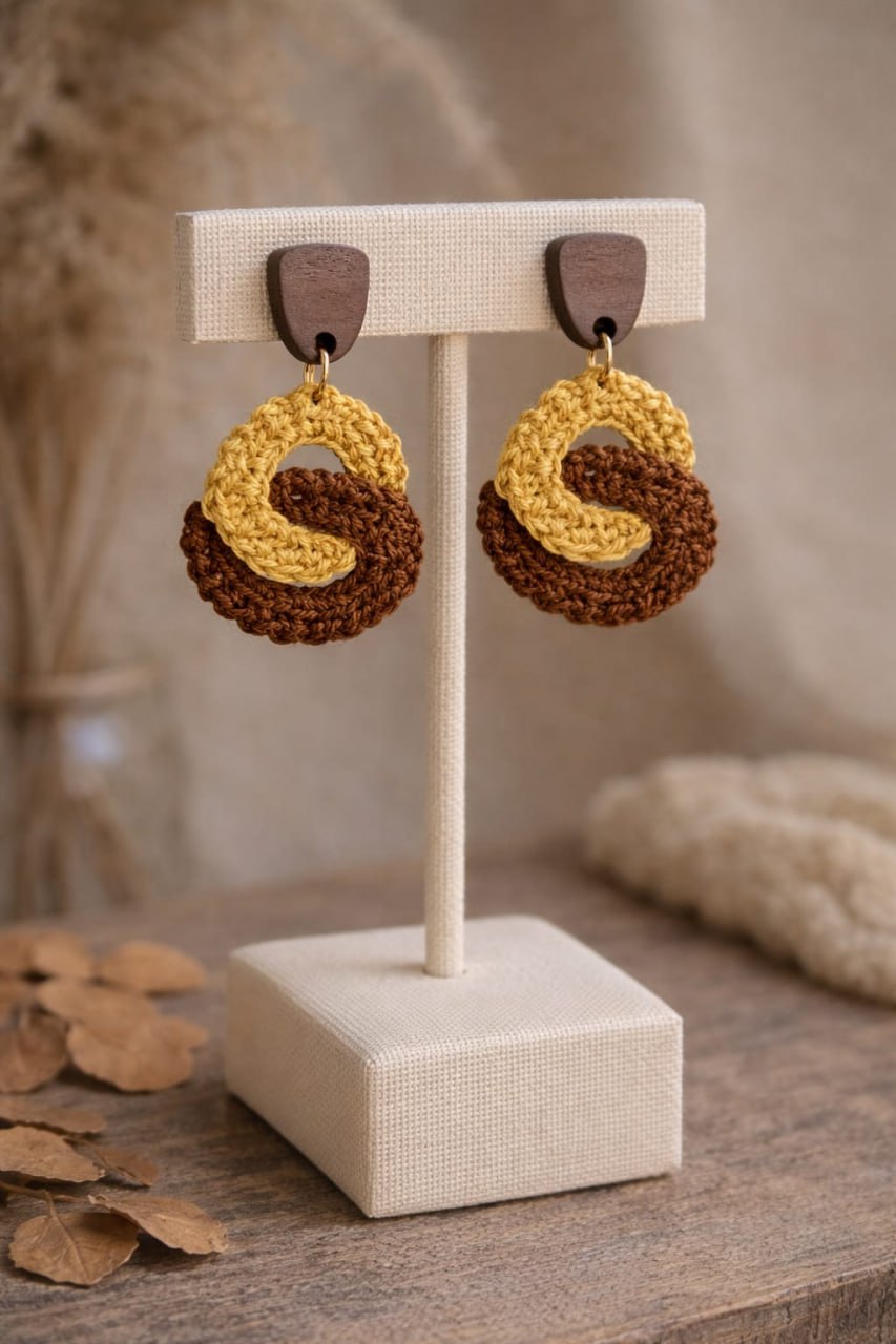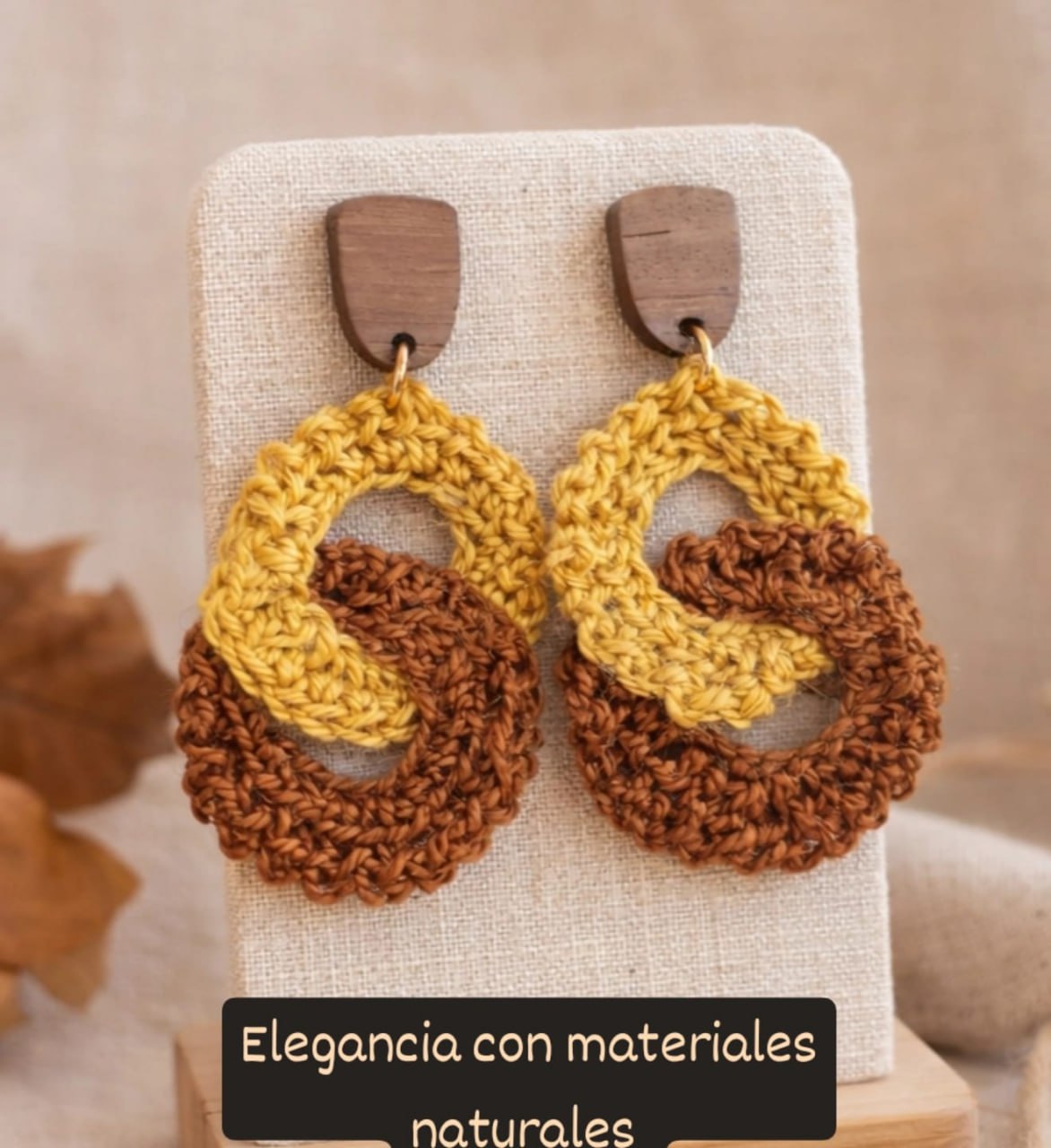 Descubre los Pendientes Modelo Sáhara, una joya que combina la tradición del crochet artesanal con la calidez de la madera natural. Hechos a mano, cada par es único y refleja la dedicación y el amor que se pone en su elaboración. Los tonos mostaza dorado y marrón tostado se entrelazan de manera armoniosa, creando un accesorio ligero y lleno de carácter.